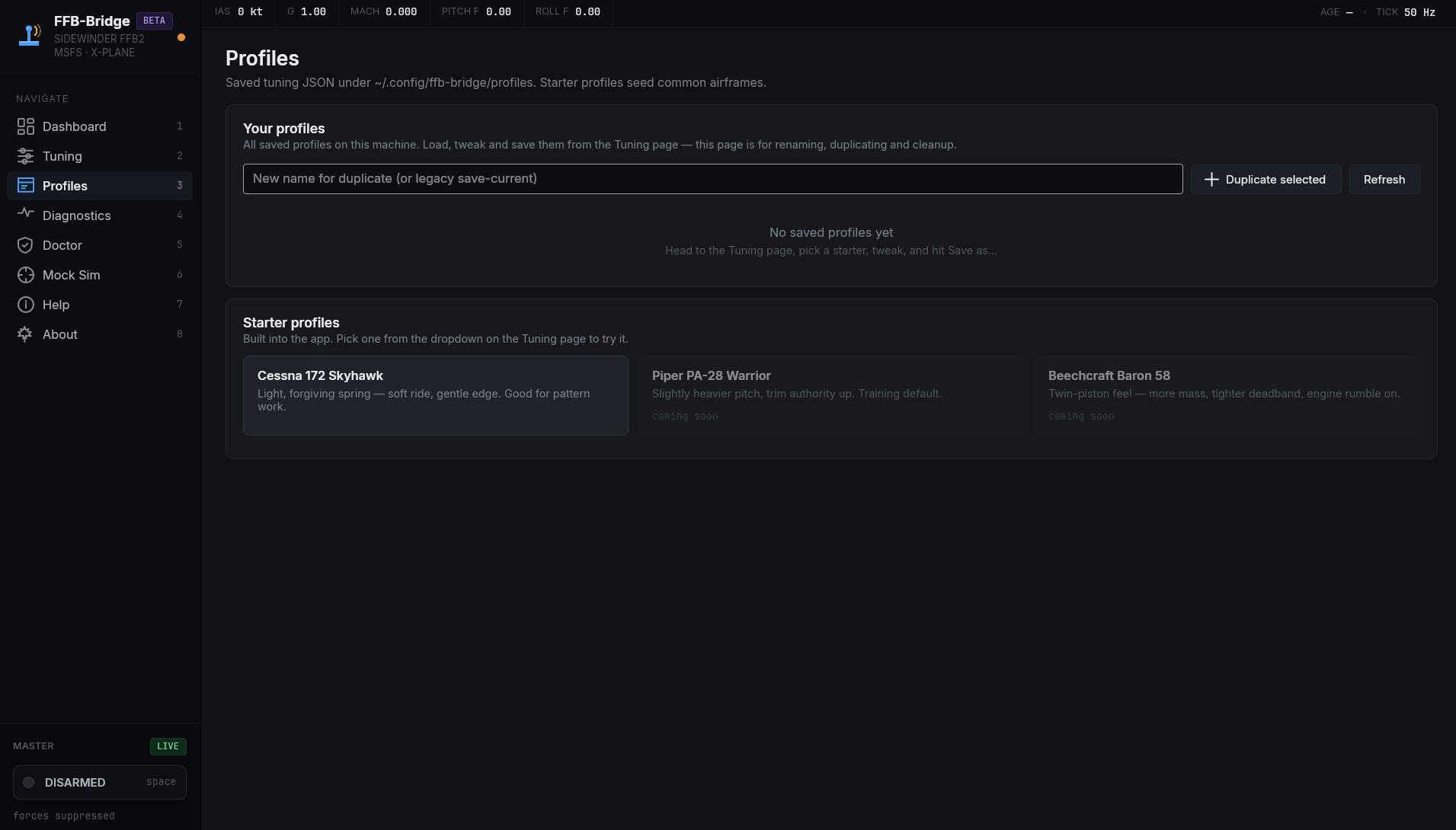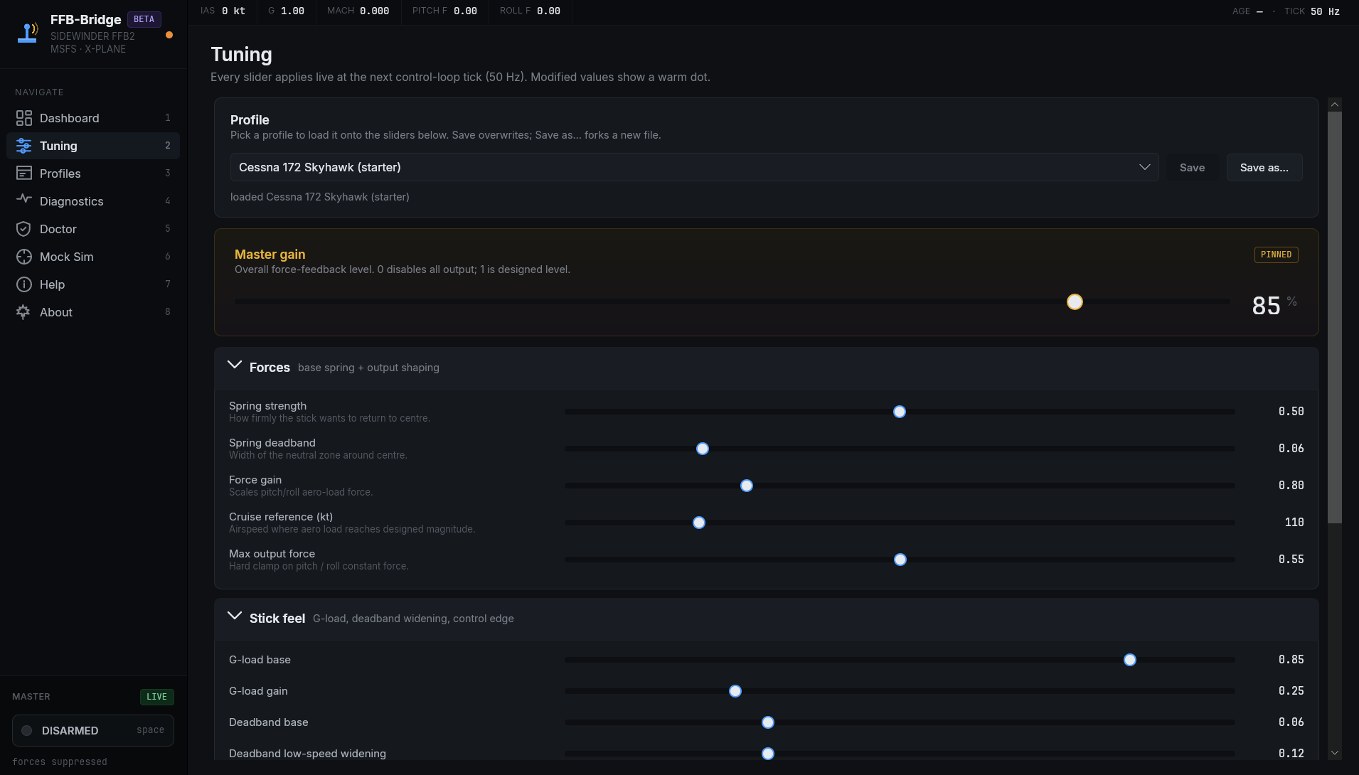 Every value is local: no servers, no telemetry. Dial them in from the Tuning page, save as a named profile per aircraft.